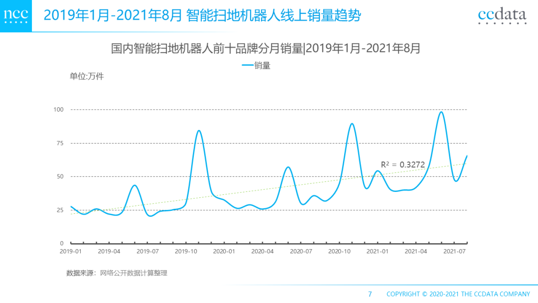 從線上銷售額數(shù)據(jù)來看,智能掃地機(jī)器人2021年1-8月銷售額同比2020年提升103%。2021年1至8月,智能掃地機(jī)器人前十品牌線上GMV已達(dá)84億元人民幣,考慮到年期促銷及銷量增長(zhǎng)率,今年該智能家居品類破百億銷售額幾無懸念。同時(shí),從消費(fèi)節(jié)奏趨勢(shì)看,促銷活動(dòng)對(duì)智能掃地機(jī)器人的潛在消費(fèi)群體有顯著的購(gòu)買驅(qū)動(dòng)力,618、雙十一等促銷季對(duì)其銷量有很大提升。