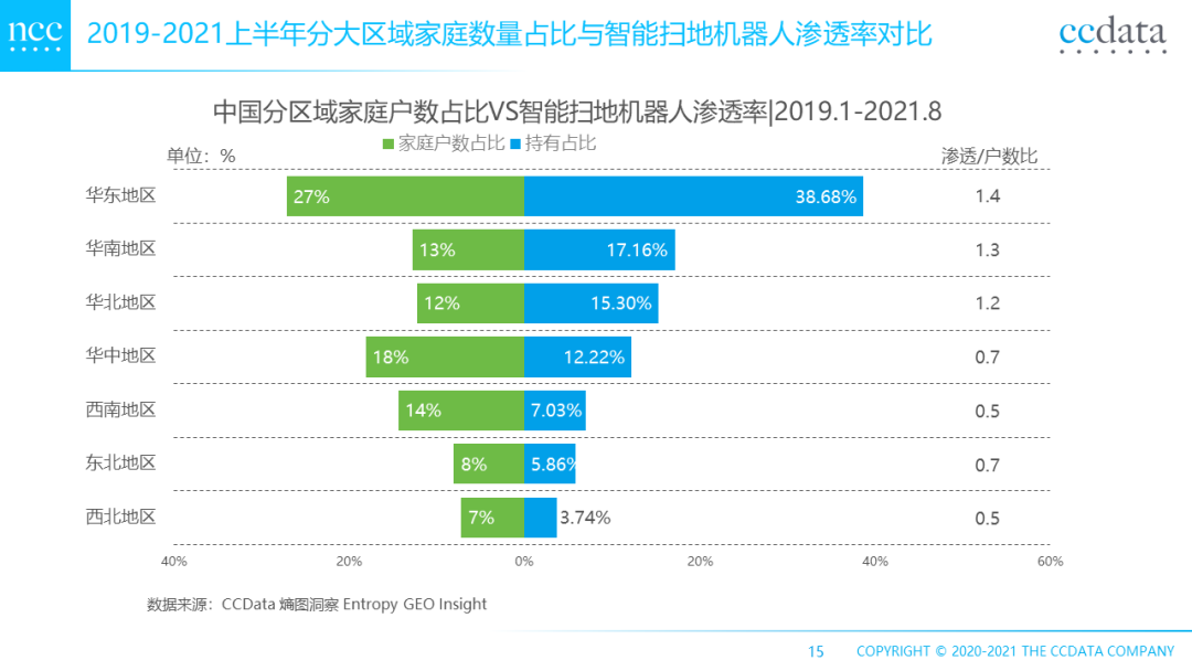 中科網(wǎng)聯(lián)“熵圖”洞察數(shù)據(jù)顯示, 華東、華南、華北掃地機(jī)器人持有率占70%,滲透戶數(shù)比超過1.0,同時(shí),一線城市家庭的滲透/戶數(shù)比最高,也就是一線城市家庭對(duì)智能掃地機(jī)器人接受度更高,雙職工家庭、健身家庭也擁有更高滲透程度。