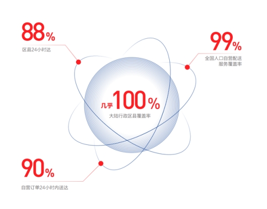 《報告》顯示,京東物流大件和中小件網絡已實現大陸行政區縣幾乎100%覆蓋,88%區縣可以實現24小時達,自營配送服務覆蓋了全國99%的人口,超90%自營訂單可以在24小時內送達。