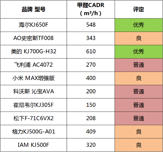 本次十款對比測試產品中,只有海爾KJ650F、美的 KJ700G-H32兩款產品的除醛系數高于0.8,綜合凈化性能要優于其他產品。