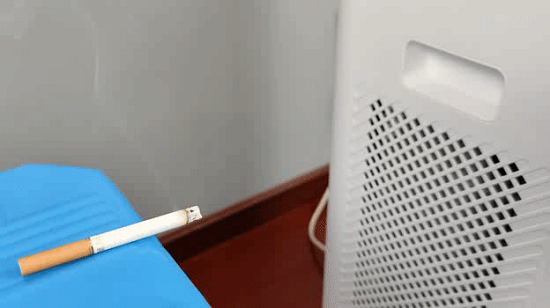 十款產品均采用同樣的檢測步驟,污染物為香煙,在距離凈化器側面10cm處,放置點燃的香煙10s,然后開啟凈化器,檢測開啟凈化器最大檔30秒之后的出風口的PM2.5數值。