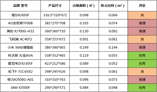 對比數據顯示,十款產品中,有6款產品占地面積小于0.1㎡,4款產品大于0.1㎡,所占空間中,8款產品低于0.08m³,僅美的 KJ700G-H32和小米MAX增強版空間高于0.08m³。