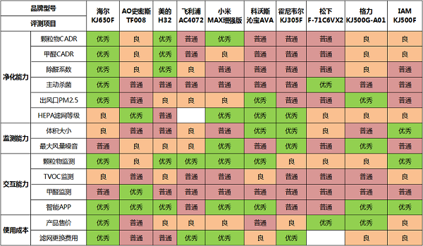 綜合本次評測結果,十款產品中,顆粒物凈化,海爾、美的、小米表現突出,甲醛凈化,海爾、美的表現突出,除醛系數一項,海爾、美的最為突出,主動殺菌上只有海爾和松下擁有。綜合凈化能力方面,海爾KJ650F表現最為突出,其次是美的KJ700G-H32,這兩款產品要明顯優于其他凈化器。但美的這款美中不足的是采用的H11等級濾網,顆粒物過濾率為10款最低。