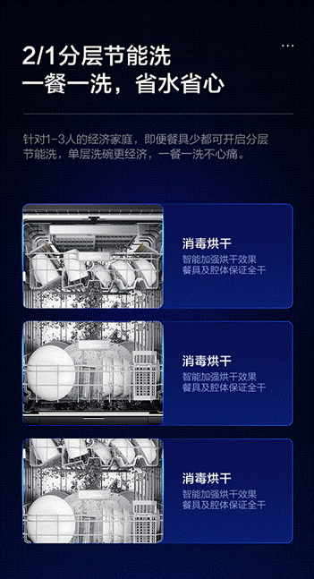 美的智能投放洗碗機F70可以實現上下分層洗,如果家中用餐的人數較多,餐具較多則可以使用全層節能洗;如果家中用餐的人數較少,則可以使用上下分層洗。可以滿足用戶不同的用餐需求,極為方便。無論哪一種方式,與其他洗碗機相比,美的智能投放洗碗機F70可以每次節約15%的水,節能環保,節能省水減少浪費。
