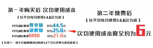 據相關介紹,目前FITURE魔鏡的用戶已經超過1.1萬人并覆蓋了從北上廣深到西藏、青海的超過300個城市,平均每月訓練次數為14.6次。值得一提的是,根據不同魔鏡產品的購買方案,用戶每次使用成本約為21元到44元,并且第二年續費后僅為6元左右,相比絕大多數健身服務來說算是性價比很高了,能達到世衛組織建議的每周150分鐘標準,并且可以供全家人使用。