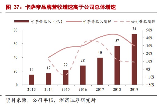 2014年-2019年,卡薩帝收入從17億元增至74億元,復合增速高達34.23%,占公司內銷總營收比例從2.19%擴大至6.97%。安信證券估算2019年卡薩帝在海爾智家內銷稅前營業利潤中占比在20%-30%之間。