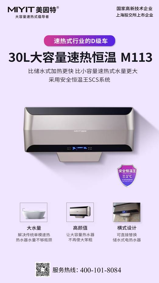 自從2019年起,美因特就重點發力大容量速熱式電熱水器的研發,2020年,30L的大容量速熱M113上市,精致的外觀,充沛的水量,穩定的產品品質,贏得了良好的口碑。M113具有30L大容量,冬天洗澡也不用擔心水量不夠;夏天采用夏季模式,內膽溫度設置為50度,加熱幾分鐘,可以一直洗,帶給消費者絕佳的沐浴體驗,甚至可以即開即熱。夏季模式下工作不結水垢,熱水器壽命更長。M113采用了內置安全恒溫王SCS系統,恒溫更安全。消費者也可以選擇外置恒溫閥的產品,安裝非常簡單。
