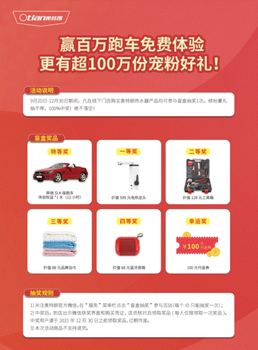 本次大促活動全面覆蓋線上和線下,規(guī)模陣仗空前。無論是通過奧特朗線下終端門店購買熱水器還是奧特朗線上電商平臺完成指定任務(wù),均可參與盲盒抽獎,盲盒獎品設(shè)置豐富,奧特朗承諾,每一位消費者都能100%中獎。