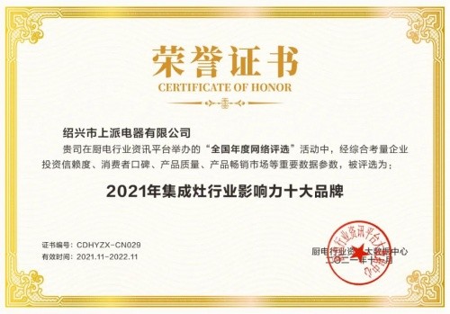 恭祝上派榮獲“2021年集成灶行業影響力/消費者好口碑十大品牌”稱號