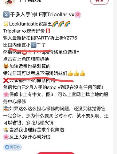 同時網友指出,國內價格高遠比海外高,單品TriPollar Stop VX才2600元左右,黑五活動能到2200元,但海外銷售的初普美容儀不向國內發貨。“初普美容儀涉嫌中外雙標,售賣價在國內價格比國外高太多了。在國內通過銷售套裝賺取高額利潤的做法十分明顯。”