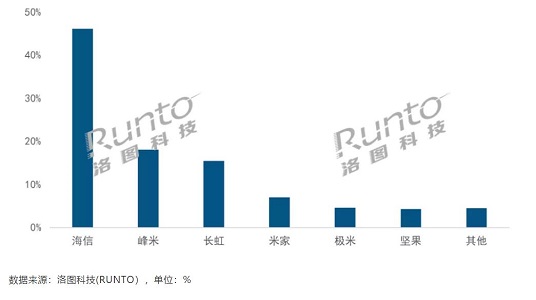 洛圖科技數據顯示,2020年國內激光電視出貨量第一是海信,占比僅50%,第二是峰米,占比近20%,第三市場紅,占比近20%,第四是米家,占比近10%。第五是極米,占比5%左右。