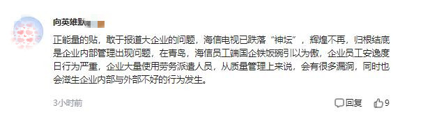 正能量的貼,敢于報道大企業的問題,海信電視已跌落“神壇”,輝煌不再,歸根結底是企業內部管理出現問題,在青島,海信員工端國企鐵飯碗引以為傲,企業員工安逸度日行為嚴重,企業大量使用勞務派遣人員,從質量管理上來說,會有很多漏洞,同時也會滋生企業內部與外部不好的行為發生。(石頁)
