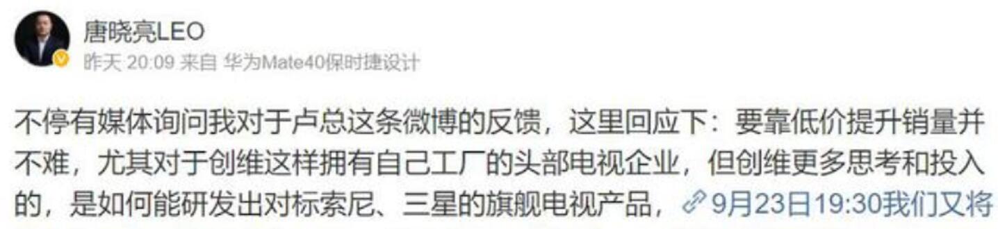 昨天晚間,創維電視首席品牌官唐曉亮在微博上表示,“不停有媒體詢問我對于盧總這條微博的反饋,這里回應下:要靠低價提升銷量并不難,尤其對于創維這樣擁有自己工廠的頭部電視企業,但創維更多思考和投入的,是如何能研發出對標索尼、三星的期間電視產品。”唐曉亮還在微博上@了盧偉冰。