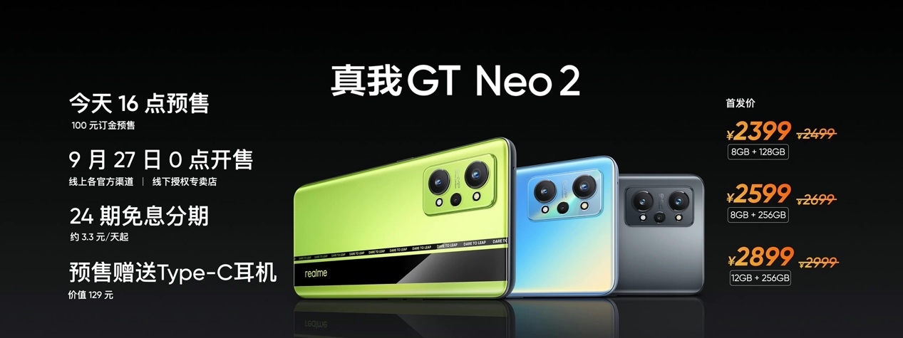 價格方面,真我GT Neo2 8GB+128GB售價2499元,8GB+256 GB 2699元,12GB+256GB售價2999元,首發購買各版本減100元,購買時加199元可換購黑薄荷配色Realme Buds Air2,真我GT Neo2 將于9月27日全渠道正式開售。