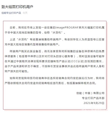 “ 終端用戶購買此類設備后,將無法享受我司所銷售的設備在保修期內的免費保修服務(包括零件保修以及針對打印頭的安心服務等),同時這類設備可能存在未通過中國相關法律法規所要求的強制性產品認證(CCC認證)及檢測的情況,由于產品來源和狀態不確定,不排除引發安全事故并由此給終端用戶帶來人身和財產損失的可能性。”