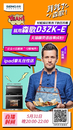 5月31日,森歌舉辦《拜托了,森歌!》D3ZK-E天貓直播體驗活動,現(xiàn)場特邀法國大廚、美食達(dá)人安鬧鬧與他的兒子一起來到森歌天貓官方直播間擔(dān)任森歌產(chǎn)品體驗官,傳授用森歌D3ZK-E天貓精靈語音集成灶輕松搞定熊孩子的營養(yǎng)餐,以及傳授8分鐘制作歐包的獨家秘方。“天貓精靈,播放音樂!” “天貓精靈打開高溫蒸!”現(xiàn)場通過與森歌集成灶語音互動,以及將烹飪美食場景化的方式展現(xiàn)森歌集成灶的趣味性和安全性,將廚房從寶貝禁區(qū)變成親子樂園。