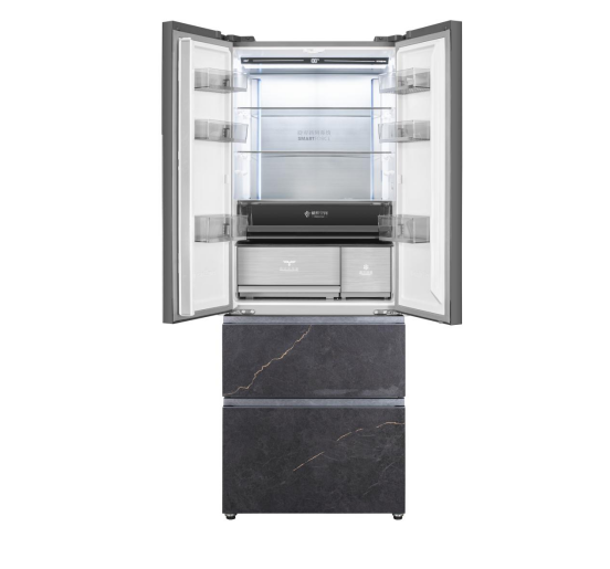 在外觀設計上,海信真空·超薄冰箱505采用了更加具有個性化的設計,冰箱前部采用了錦繡墨巖面板,10道工序、2000+℃高溫淬煉、制造出天然巖石般的表層立體紋路,并且以金箔增加配色的層次,勾勒出類似地圖的山川紋路,整體顏色搭配非常高級,并且彰顯出主人的格局和貴氣。