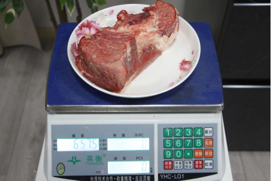 牛肉總重量678.5g放置于冷凍層深度冷凍24小時,后置于速冷鎖鮮艙進行解凍,觀察其血水溢出情況。實際測試可以發現,牛肉在解凍后水分僅僅損失21g,而盛放牛肉的容器中沒有血水溢出,用紙巾擦拭牛肉表面也僅有細微的水漬,牛肉很好地保持了肉類的鮮嫩狀態。