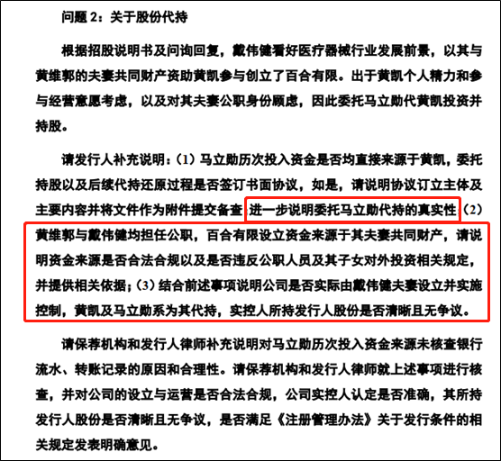 2020 年 10 月 30 日上海證券交易所在第二輪審核問詢函中明確指出百合醫療設立資金來源于黃凱父母的夫妻共同財產,質疑資金來源是否合法合規,是否違反公職人員及其子女對外投資相關規定,質疑百合醫療是否實際由戴偉健夫妻設立并實施控制,黃凱及馬立勛系為其代持,實控人所持發行人股份是否清晰且無爭議。