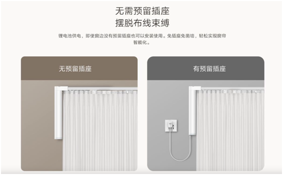 全新的米家智能窗簾采用了鋰電池供電,即使窗簾旁沒有預留插座也可以輕松安裝使用。不用插座也可以實現窗簾智能化。