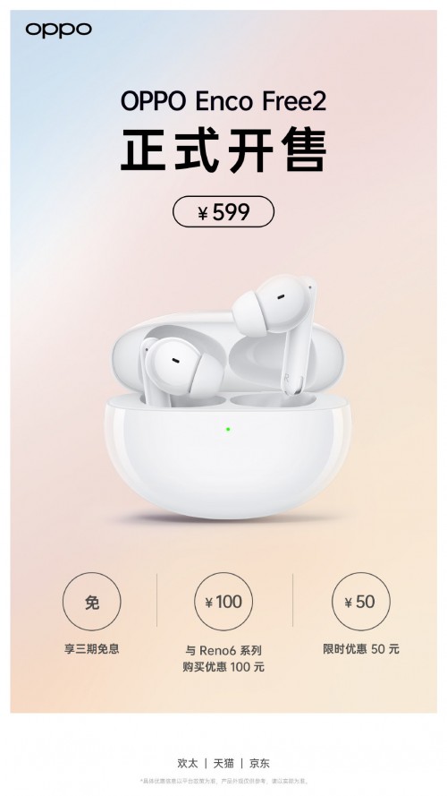 OPPO Enco Free2真無線耳機現(xiàn)已在OPPO線下官方授權(quán)門店和OPPO官方商城-歡太商城、京東、天貓、蘇寧同步開售,售價599元。6月5日當(dāng)天購買可享立減50元優(yōu)惠,僅需549元即可入手。618期間還可享受三期免息,與OPPO Reno6系列手機一同購買可享100元優(yōu)惠。更有更多品牌優(yōu)惠,敬請持續(xù)關(guān)注OPPO 618。聲學(xué)旗艦OPPO Enco X以及OPPO Enco Air等真無線耳機產(chǎn)品同樣在售,歡迎大家選購。