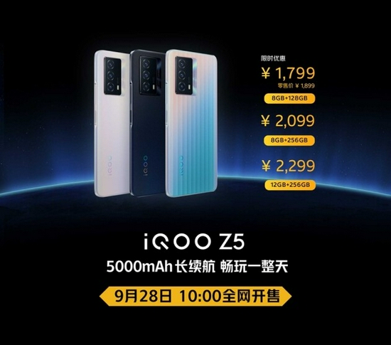 iQOO Z5提供提供“藍色起源”、“薄暮晨曦”和“造夢空間”三大配色,預售期間8GB+128GB版本售價1799元,8GB+256GB版本售價2099元,12GB+256GB版本售價2299元。9月28日10:00將在vivo官網、京東、天貓、蘇寧易購vivo手機官方旗艦店正式發售,iQOO線下各大授權門店、vivo體驗店同步開售,還有更多驚喜福利,感興趣的朋友千萬別錯過。
