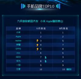 從9月數(shù)據(jù)看,和8月蘇寧易購平臺(tái)整體大致相同,銷售業(yè)績(jī)最好的前十名中,除了三星擠掉魅族躋身前十以外,其余都是老面孔,分別是小米、Apple、realme、榮耀、OPPO、vivo、iQOO、華為、一加。