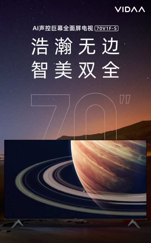 VIDAA旗下的另一款核心產品VIDAA 70 V1F-S擁有一塊96%的高占屏比的70英寸無邊全面屏;3840x 2160分辨率,4K HRD精銳解析,MEMC運動補償技術塑造的畫質帶給用戶更清晰,更逼真的家庭觀影體驗;搭載的AI音畫智能識別技術,幫識別新聞、體育、電影、綜藝、動畫等場景內容,滿足你不同類型的觀看需求;遠場語音+遙控器語音雙控制,不必動手,張張嘴就能實現操控。