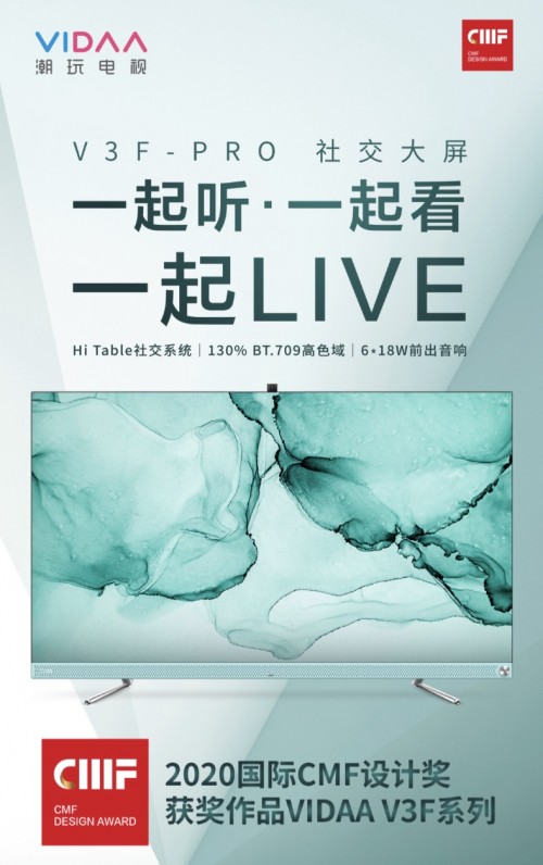 作為VIDAA在2020年下半年推出的主打產品,VIDAA小青電視 V3F系列設計靈感源自北歐設計的自然美學,突破常規采用了豆蔻青的配色,匠心獨運地采用U型、圓、圓柱等簡約的基本幾何元素,搭配CNC雕琢發光LOGO,鋼棒電鍍金屬懸浮底座,打造出高顏值外形令人驚艷,去年更榮獲2020年度國際CMF設計獎(行業頂級設計獎項)。