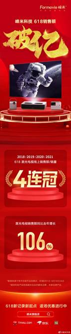 從市場(chǎng)趨勢(shì)看,大屏得到了消費(fèi)者與商家齊齊青睞,歐洲杯的到來(lái)在一定程度上對(duì)大屏消費(fèi)市場(chǎng)產(chǎn)生了推動(dòng)作用。歐洲杯恰逢6.18年中購(gòu)物節(jié),市場(chǎng)對(duì)大屏的熱衷也體現(xiàn)在了峰米科技的6.18戰(zhàn)報(bào)上,2021年峰米科技又雙叒叕斬獲618激光電視品類(lèi)線上銷(xiāo)售額和銷(xiāo)量TOP1,連續(xù)四年獲得同品類(lèi)線上銷(xiāo)售雙料冠軍,銷(xiāo)售額破億,且同比增長(zhǎng)106%。