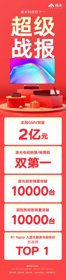 本屆雙十一,峰米科技刷新過(guò)往紀(jì)錄,再創(chuàng)多項(xiàng)佳績(jī):全網(wǎng)GMV破2億,強(qiáng)勢(shì)榮膺激光電視線(xiàn)上銷(xiāo)售額和銷(xiāo)量的雙料冠軍,自2018年起達(dá)成四連冠!此次獲得的耀眼戰(zhàn)績(jī),再一次證明了峰米品牌在家用激光投影市場(chǎng)的領(lǐng)軍地位和來(lái)自消費(fèi)者的品質(zhì)認(rèn)可。