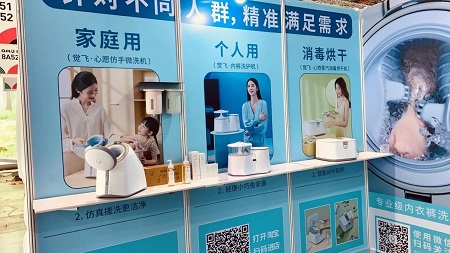 在本次展會上最吸睛當屬JOYFACE覺飛推出的新品——心愿仿手微洗機,據相關負責人介紹,這款產品適用于2~3人小家庭的貼身衣物清潔。