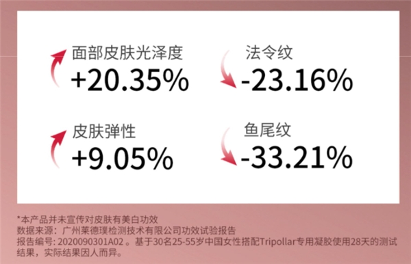 根據可查詢到的第三方測試機構給出的關于TriPollar初普的功效試驗報告,30名25-55歲中國女性在使用TriPollar初普28天后,面部皮膚光澤度增加20.35%,法令紋降低23.16%,皮膚彈性增加9.05%,魚尾紋減淡33.21%。