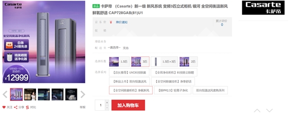 卡薩帝云鼎空調:新一級、變頻3匹、除菌凈化