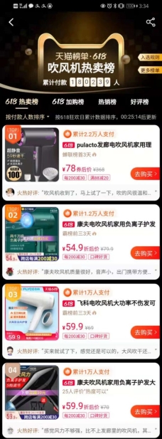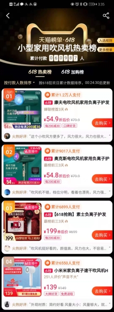 可以看到,618期間除了天貓熱銷爆款、加購(gòu)榜上常年穩(wěn)居銷量TOP3的大功率吹風(fēng)機(jī)和家用小型吹風(fēng)機(jī),天貓平臺(tái)的其它康夫品牌產(chǎn)品,類似卷發(fā)棒、負(fù)離子吹風(fēng)機(jī)等也開(kāi)始受到消費(fèi)者青睞,并成功進(jìn)入細(xì)分產(chǎn)品榜單TOP5中。