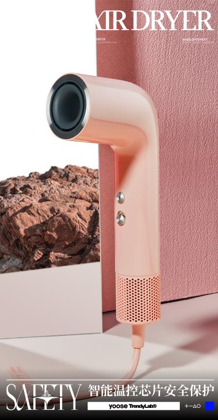 yoose有色 NO.7高速吹風機。作為全合金一體化“ 7 ” 字型設計的高速吹風機,憑借獨特的7字型空氣動力學風道。再次獲得日本G- Mark設計大獎。這樣的設計應用在吹風機設計中還是第一次。一款好的吹風機,就是在通過高風速快速帶走發絲水分的情況下吹干我們的頭發,保證頭發在吹干的同時,保持秀發的光澤與健康。一般來說女生對于吹風機會比較挑剔一些,因為她們更在意形象,幾乎每隔一天就得洗頭發,一洗頭發基本就離不開吹風機,所以吹風機的重要性,不言而喻。
