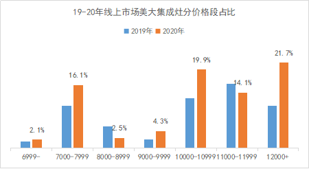 與此同時,美大品牌的高端定位也體現在價格段布局上的搶眼表現。奧維云網(AVC)監測數據顯示,2020年,線上市場美大集成灶在10000-10999元價格段的占比為19.9%,在12000元以上價格段的占比為21.7%,處于明顯的優勢地位;線下KA渠道美大集成灶在10000元-19999元價格段的平均占比達到30%左右,在20000元以上的高端價位段的占比達36.4%,牢牢地鎖定了全渠道市場的高端席位。