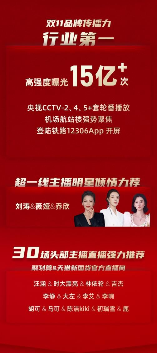 牽手品牌形象代言人兼首席產(chǎn)品推薦官CPO劉濤 展開深度合作,持續(xù)搶占央視CCTV、機(jī)場(chǎng)航站樓等流量高地;雙 11 期間霸屏 鐵路12306App 、 鳳凰新聞App 、 菜鳥裹裹、高德地圖、酷狗音樂、天貓精靈、土豆視頻、閑魚、優(yōu)酷視頻、UC瀏覽器等各大主流App開屏位 ,覆蓋數(shù)億人 次 ; 攜手頭部主播薇婭 和十多名明星主播,在天貓、京東、抖音、快手等各大平臺(tái)直播間進(jìn)行多維度覆蓋。