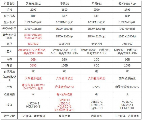 1.價格方面,堅果G9>堅果P3S>天貓魔屏 青選N2>極米NEW Play。