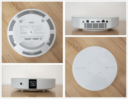 堅果G9采用了類似“圓餅”的設計,我個人覺得它更加適合吊裝的使用場景。接口方面,其豐富程度是幾臺投影儀中最好的,不僅配備了常見的HDMI、USB-A接口,還增加了S/PDIF接口和RJ45網絡接口。