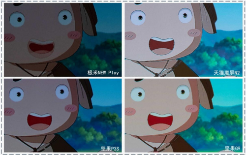 幾款產品的差異比較大,極米NEW Play標稱亮度最低只有250ANSI流明,而天貓魔屏 青選N2最高,達到了813ANSI流明。