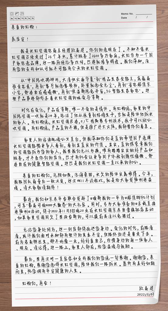 值得一提的是,在長虹空調電商總經理歐總歐高建出場之際,主持人就在直播間介紹了他為用戶寫的一封親筆信。在信中,歐高建感慨地寫道,迄今,長虹空調已經走過了26個年頭,累計服務了2600萬多家庭。他再三感謝廣大虹粉的一路陪伴,并表明出席這次活動意在回饋用戶,給大家發福利、送溫暖。