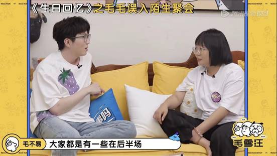 在節(jié)目嘉賓到來之前,李雪琴問到毛不易是否與即將到來的張歆藝相熟,毛不易表示與二姐有微信,還向李雪琴講述了一個社恐人群進(jìn)入陌生聚會的嚇人回憶。前一段時間恰逢二姐張歆藝過生日,毛不易被阿雅叫去參加聚會,本以為都是認(rèn)識的朋友,結(jié)果是《乘風(fēng)破浪的姐姐》舉辦party。“里面坐了三十個姐姐,當(dāng)時已經(jīng)進(jìn)行到后半場,阿雅在最里面我也過不去,只能趕緊把自己灌醉。”同為社恐的李雪琴聽完卻幸災(zāi)樂禍地直拍大腿:“太妙了,這種場面你多經(jīng)歷點,多講一講,太好聽了這種故事。”她表示自己也非常恐懼各種后臺、晚會、典禮,引起毛不易強(qiáng)烈共鳴。