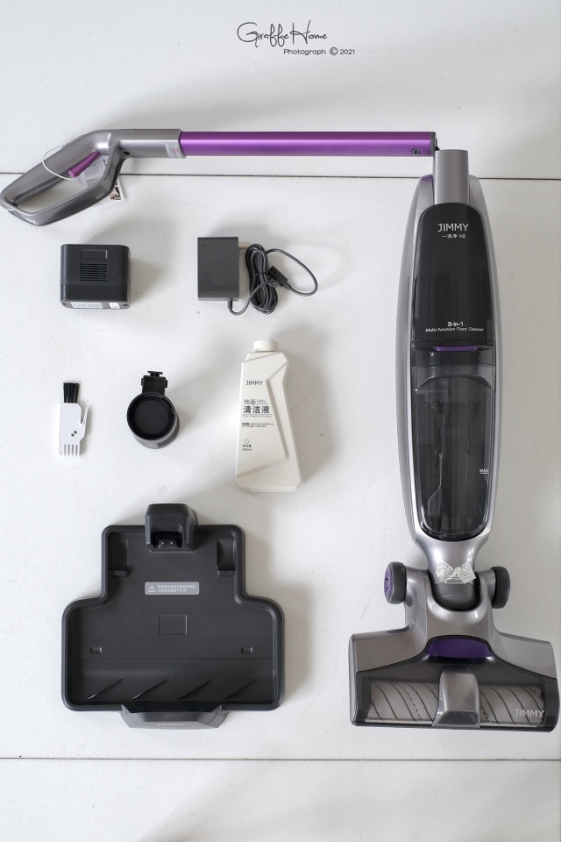 卡扣式的設計,在組裝紫色把手的時候,要稍微用力插上并聽到咯噔一聲就可以了。把手安裝到位后,就將原裝附贈的電源裝入即可。值得注意的是,這塊小小的電源是8*3000mAh大容量電池,功率表現還挺不錯,一次充電后使用,實際續航能力最高可以達到30分鐘,清潔我們200多平方米的工作室完全沒有問題。