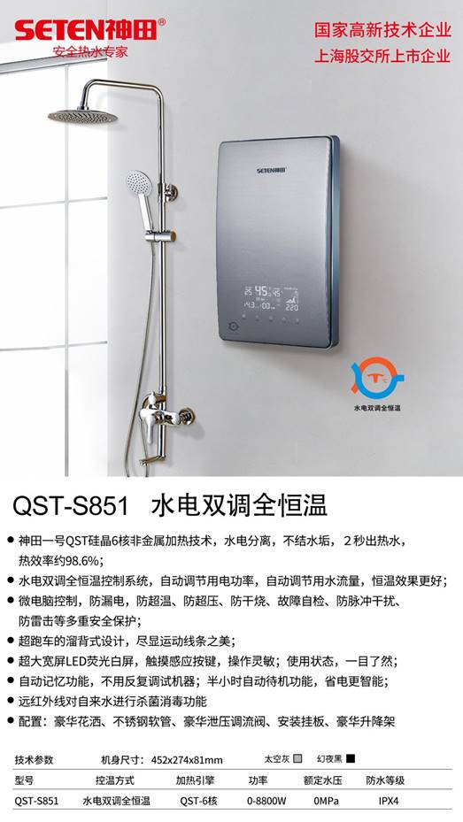 S851采用神田一號(hào)QST硅晶雙芯雙核6核非金屬加熱技術(shù),水電分離,不結(jié)水垢,2秒出熱水,熱效率約98.6%;水電雙調(diào)全恒溫控制系統(tǒng),自動(dòng)調(diào)節(jié)用電功率,自動(dòng)調(diào)節(jié)用水流量,恒溫效果更好;超跑車的溜背式設(shè)計(jì),盡顯運(yùn)動(dòng)線條之美;超大寬屏LED熒光白屏,清晰明亮;觸摸感應(yīng)按鍵,操作靈敏;微電腦控制,防漏電,防超溫、防超壓、防干燒、故障自檢、防脈沖干擾、防雷擊等多重安全保護(hù)。
