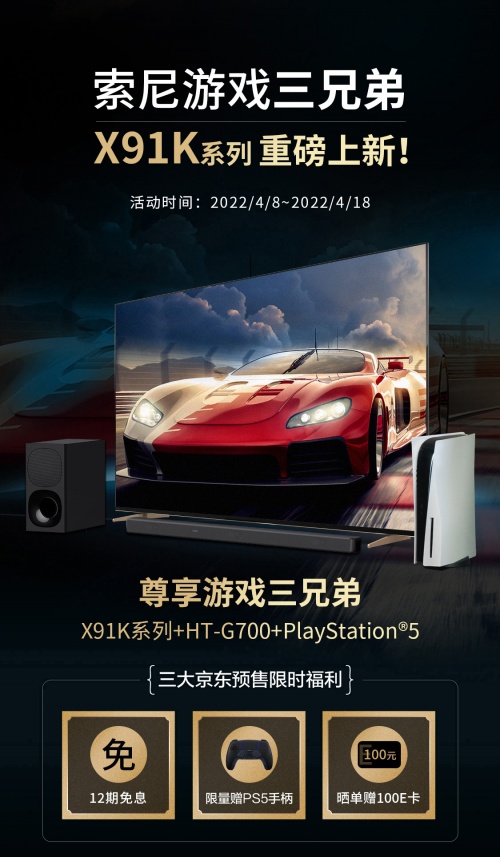目前,索尼游戲三兄弟套裝已在京東開啟預(yù)售,4月18日結(jié)束預(yù)售!為滿足不同的用戶需求,索尼有三大套裝供選:游戲套裝(含X91K + PS5)、視聽套裝(含X91K + HT-G700)、全享套裝(X91K + HT-G700 + PS5)。上京東,選擇適合自己的套裝,即可享受價(jià)格優(yōu)惠,同時(shí)更有12期免息、曬單還有機(jī)會(huì)獲得京東E卡等眾多福利。與此同時(shí),在索尼中國(guó)與京東家電官方微博,你還能參與轉(zhuǎn)發(fā)抽獎(jiǎng),并有機(jī)會(huì)獲得索尼游戲三兄弟套裝豪華大禮包!一切準(zhǔn)備就緒,只待熱愛游戲、享受生活、追求品質(zhì)視聽的你,千萬(wàn)不要錯(cuò)過(guò)!