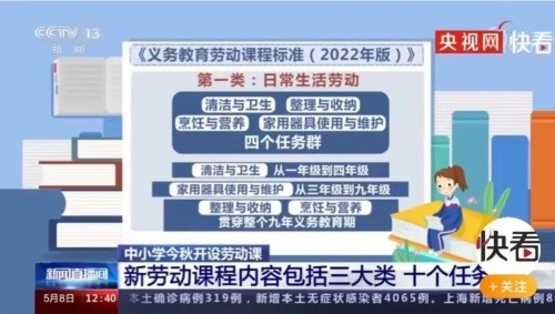 據了解,勞動課程內容共設置十個任務群,每個任務群由若干項目組成。