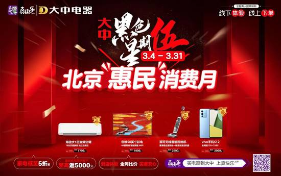 北京惠民消費月暨黑色星期伍活動火熱進行中,大中電器全門店延長營業至22:00,現場多重活動滿足消費者購物需求,涵蓋百貨專享、空調專場、冰洗專場、彩電專場、手機智能專場等一系列活動,旨為推動消費升級的同時,全面提振消費市場,積極營造讓消費者滿意的消費環境。買電器,您就選大中電器!
