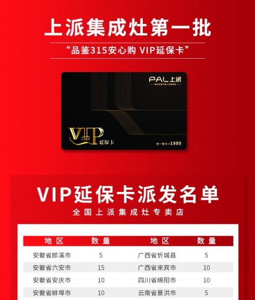品鑒315,惠享1+7, 活動(dòng)期間購(gòu)買上派款集成灶由公司總部贈(zèng)送價(jià)值1980元上派VIP延保卡。(質(zhì)保由1年升級(jí)到延保8年,每店限量10名 )