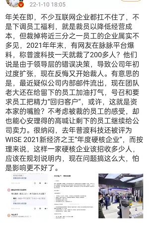 手握10億元資金的普渡科技,為何如此大規模裁員?對此,產業觀察家認為,普渡的裁員目的很簡單,因為鋪的太快,短期無法實現正向現金流,不好向投資者交代。能讓企業脫穎而出的首先要有好的技術,其次就是服務客戶的能力。普渡的渠道擴張和人員招聘工作極為倉促,沒有準確全盤衡量業務規劃,與整體戰略也不搭。當年底發現團隊的產出完全低于預期時,就會慌忙做出裁撤決定。這暴露出普渡內部很大的管理問題。